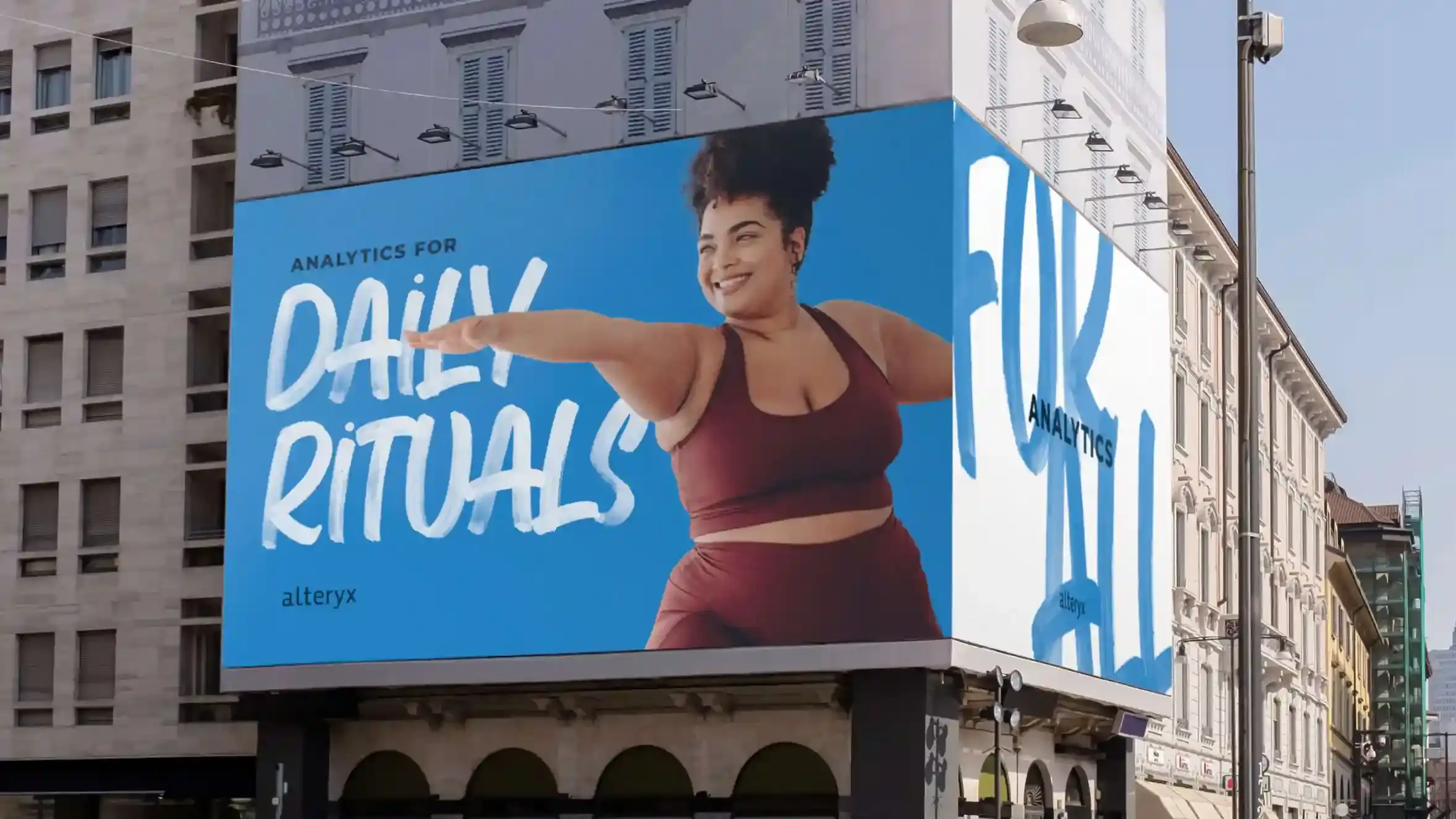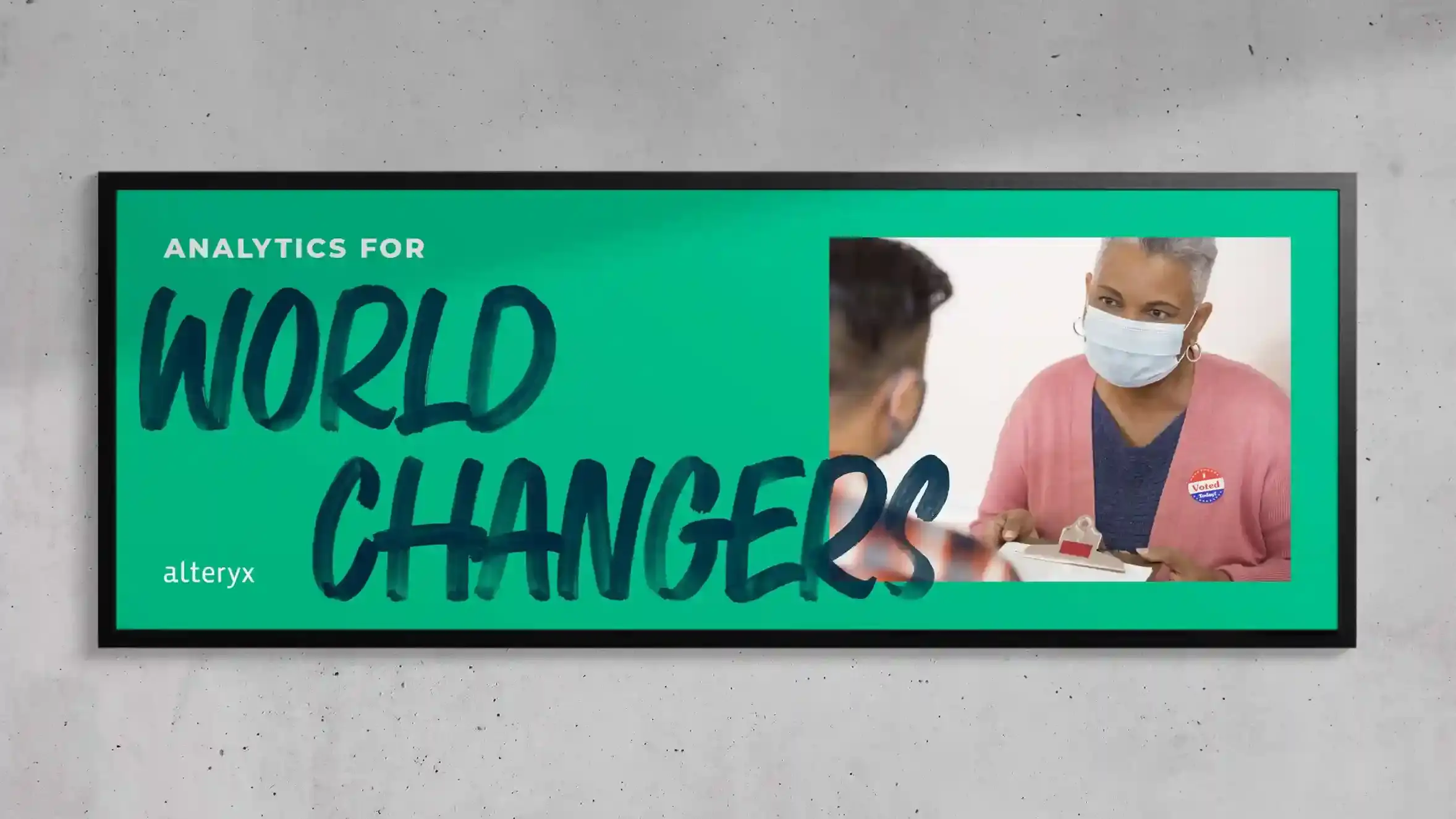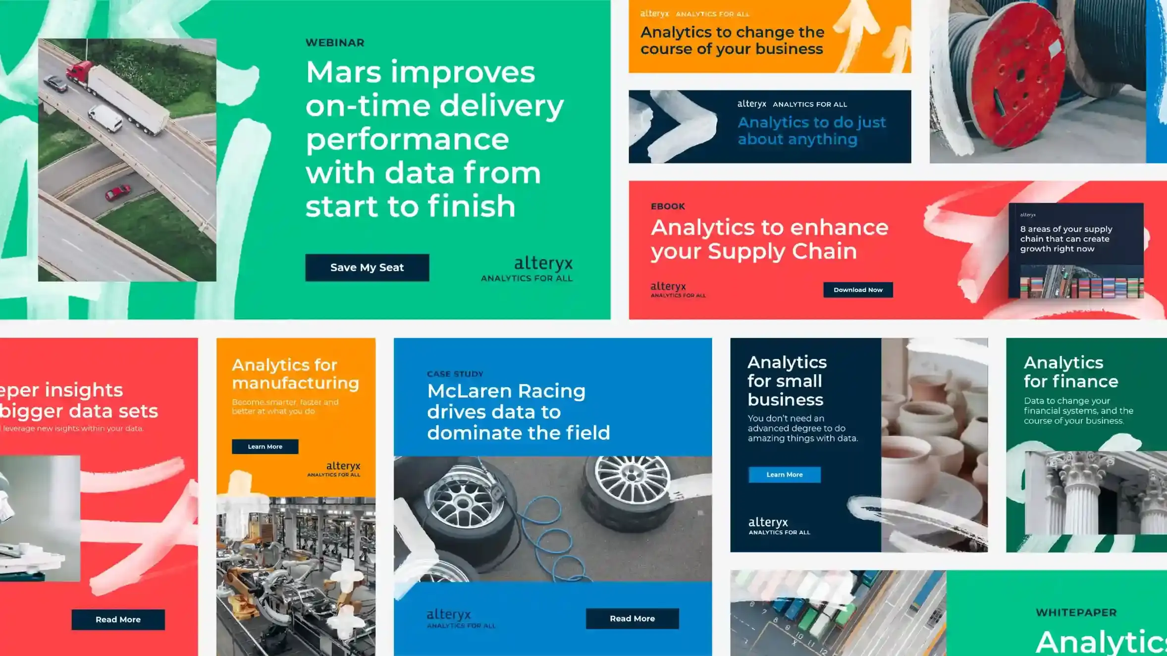 We worked closely with the marketing team and internal agency to hone in on the idea that Alteryx provides Analytics for All – a more human, ebullient, and decidedly less corporate brand expression. A human, script-like font counterbalances more technical subject matter while cementing ideas of user empowerment and democratization. Candid imagery – real people in moments of real work – showcased the tangible business improvements made possible by access to data. The campaign manifesto reinforced that Alteryx means data for world changers; it’s data that gets you.
